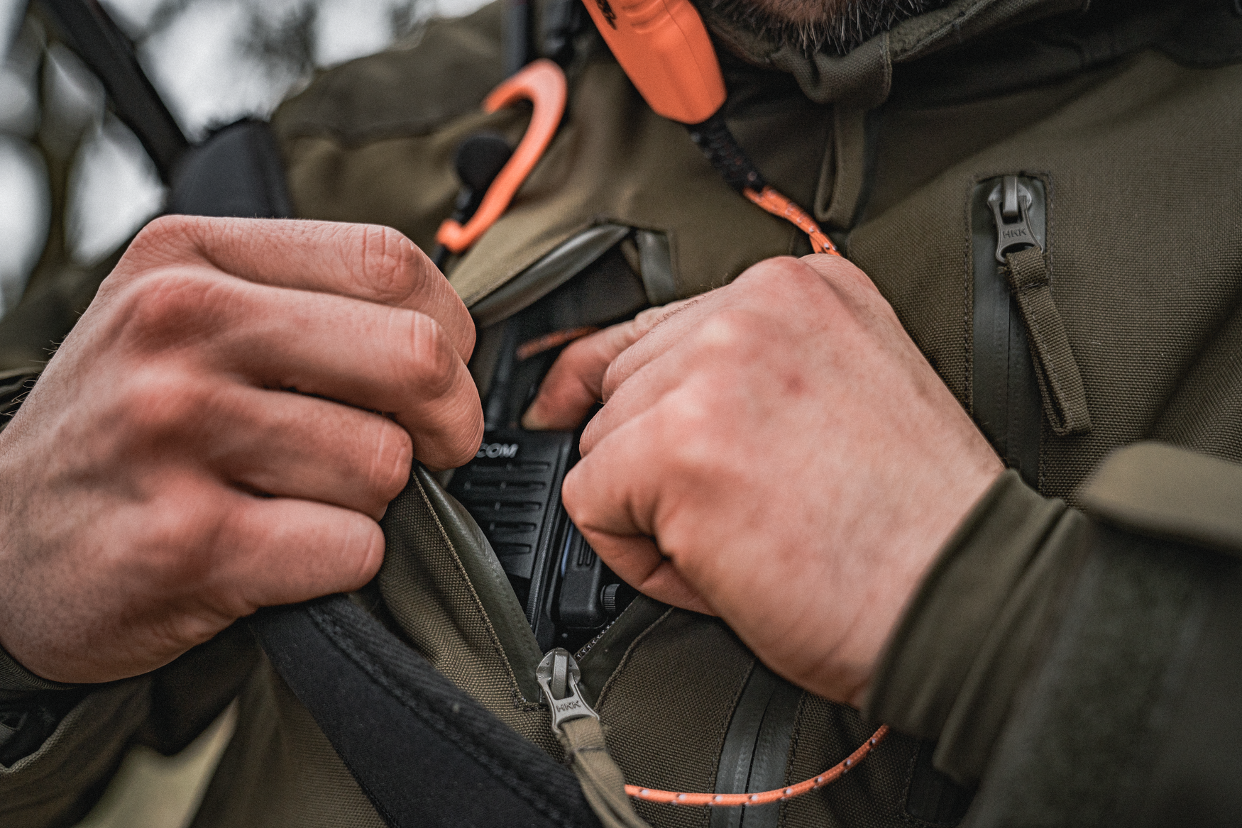 Glugă detașabilă cu fermoar, spațiu amplu pentru buzunare cu fermoare hidrofuge și un buzunar pentru vanat.